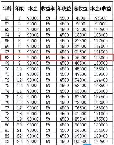 第一种情况,如果把这九万块钱拿来投资,每年5%的收益率是可以保证的,收益用来给做生活费,那么20年内的收益是: